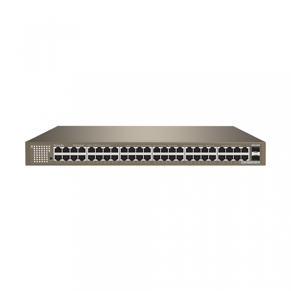 Tenda TEG1050F je 48mi portový Gigabitový Ethernet switch s 2x SFP sloty. 48 portů 10/100/1000 Mb/s + 2x SFP port 1000 Mb/s. Fanless, bez ventilátorů. Rackmount, velikost switche 19". Ochrana proti přepětí 6 kV. Přepínání VLAN nebo Standart. MAC table 16K, Jumbo Frame 12K, Buffer 12 Mb. Kovový obal.
